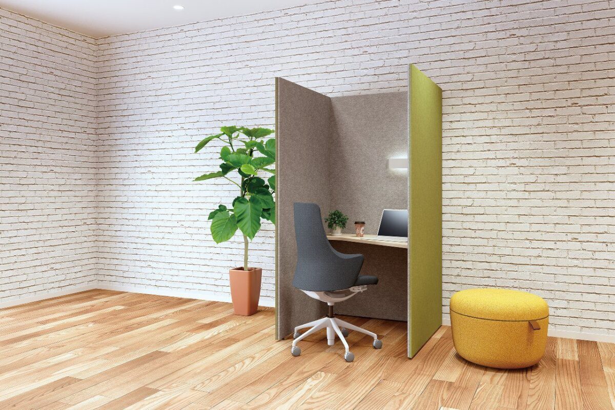 When inside the booth, the user sits facing the inside corner, cutting visual inte- reference from outside. The diagonally cut tabletop also secures ample workspace and legroom.
