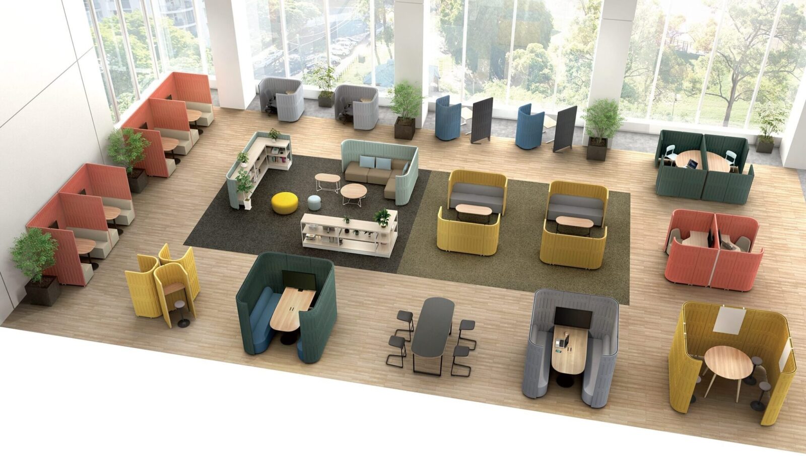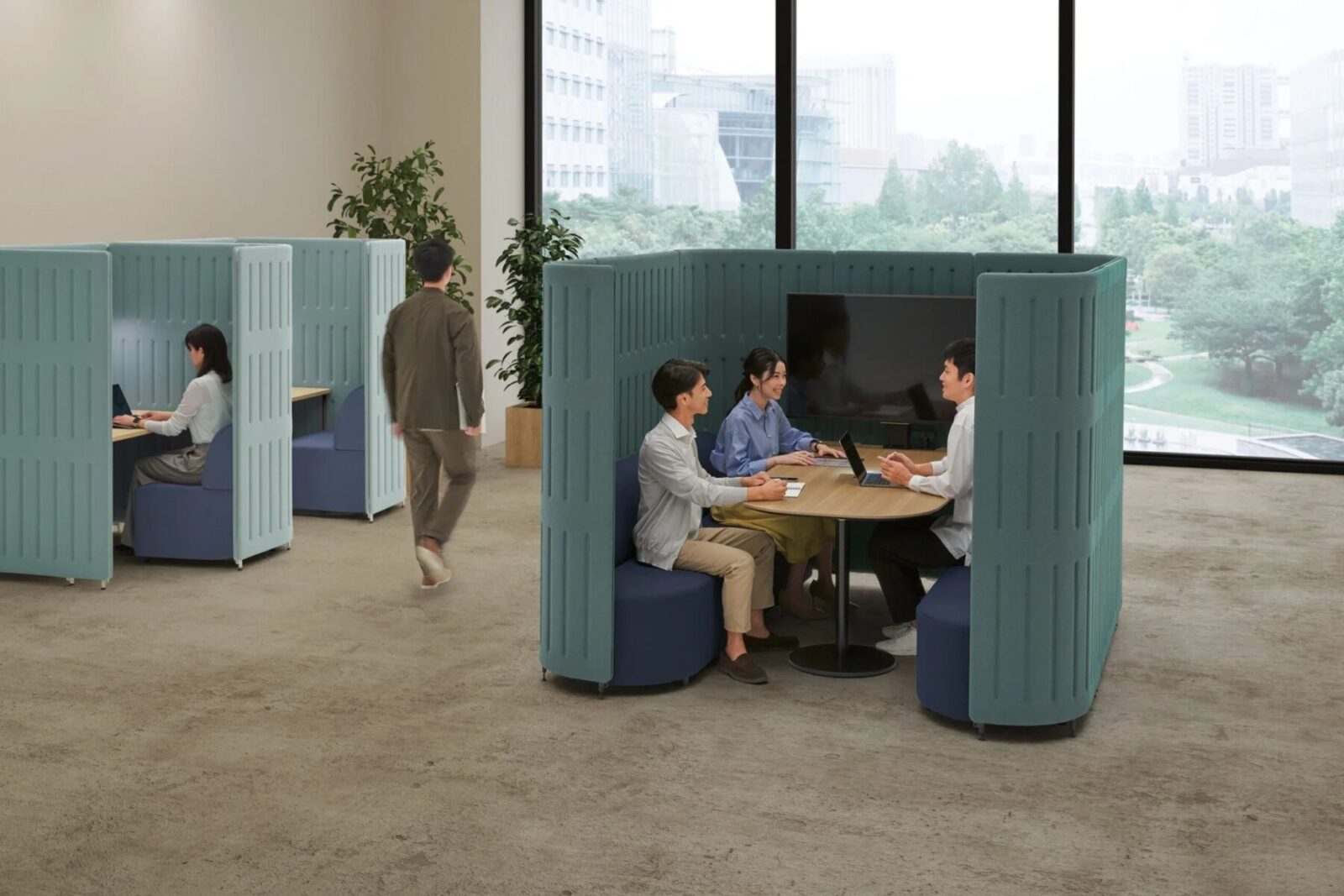 Considering the eye level, muffle has created three kinds of heights. With muffle panels, your concentration space is customizable in a straight, right-angled, T-shaped, and crossroad-shaped layout.