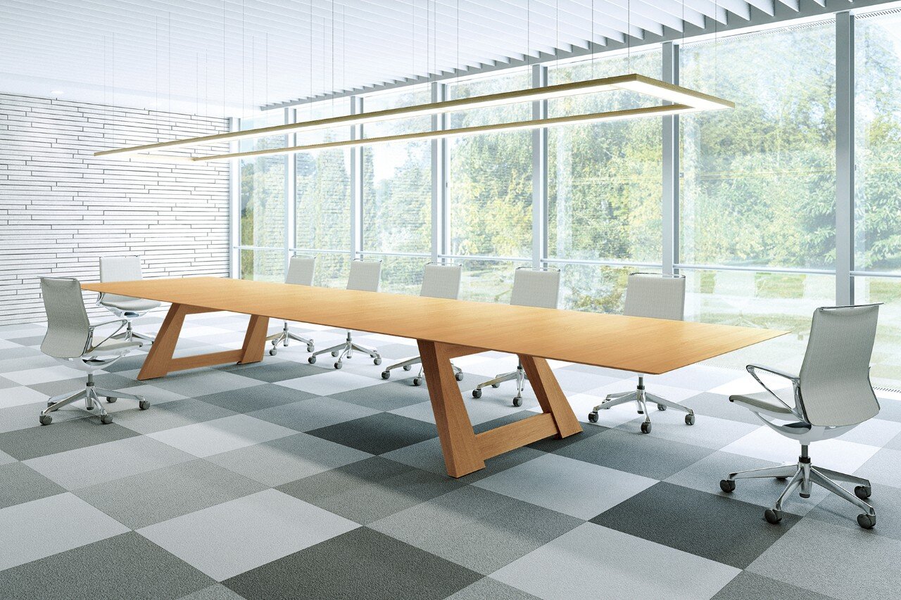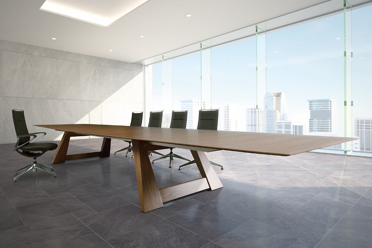 V Conference Table is a collection of two conference tables defined by narrow contours that broaden office space, bringing people together beautifully. It was meticulously designed to create a profound presence. Despite its exquisitely simple design, the table places a premium on functionality through concealed technology and strong support.